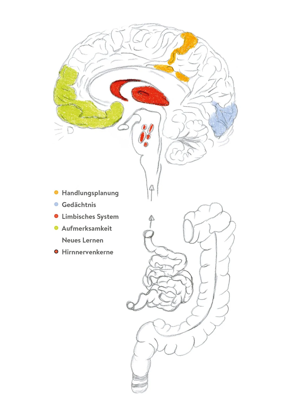 Das Bauchhirn reguliert zusammen mit den zuständigen Hirnregionen die Darmmotorik und die Verdauung. Es analysiert die Nährstoffzusammensetzung und koordiniert, was aufgenommen und was ausgeschieden wird.